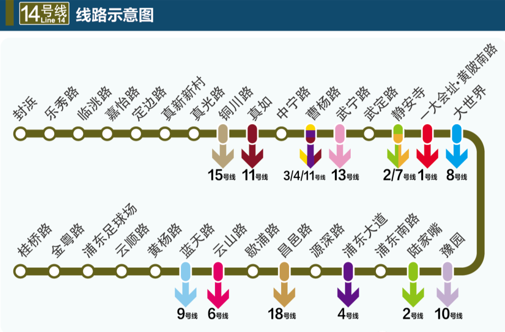 14号线换乘车站高达13座,大约5年后,随着嘉闵线开通将会至少14座(乐秀路换乘)