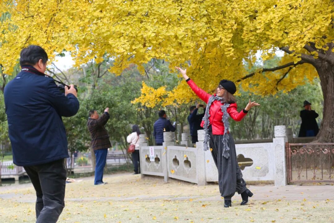 一大早,市民汪女士特地穿上了一件大红色的衣服来到公园,让爱人帮她在树下拍了不少照片。“色彩太漂亮了,我特意来好好‘拗’些造型。这棵银杏树是NO.1,在我心中是最可爱的。”汪女士说。