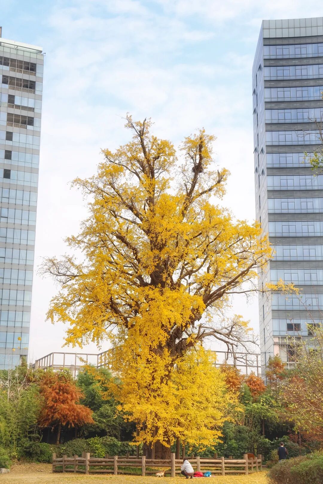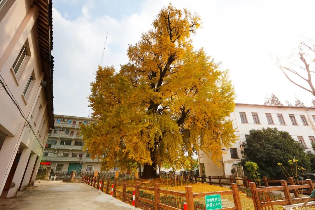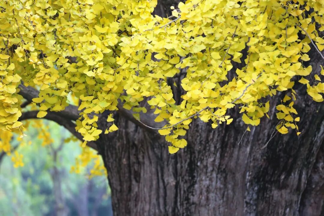 走进古树公园,远远就能看见这棵有着1200多年历史的古树,树叶基本都变成了金黄色。