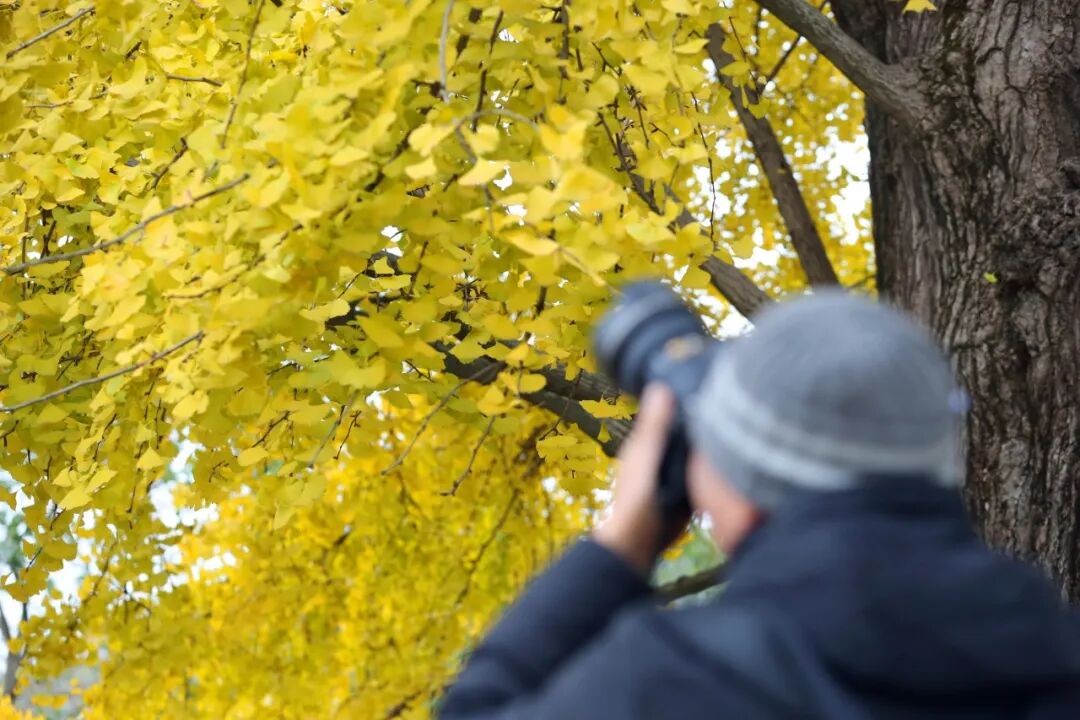 今天虽然是工作日,依然有不少市民慕名而来。古树底下,摄影爱好者们或拿手机,或用单反相机,捕捉最美的景色。