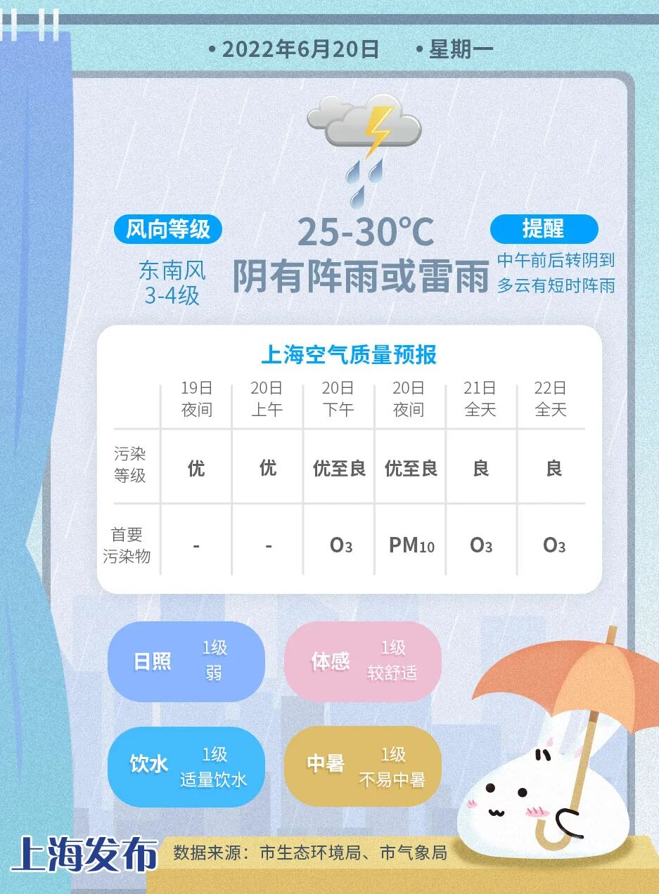 今日阴有阵雨或雷雨,中午起降雨有所减弱。全天气温在25~30度之间。体感较为潮湿。21~26日雨带呈现南北摆动态势。上海位于雨带边缘,以阴到多云为主,有短时阵雨或雷雨。其中,24日雨带在江淮一带,上海的降雨会比较明显。最低气温比较平稳,在25~27度之间。27日起,副热带高压逐渐西伸,上海会出现连续晴热天气。午后局地雷阵雨天气也随之增多,最高气温维持在34度附近。