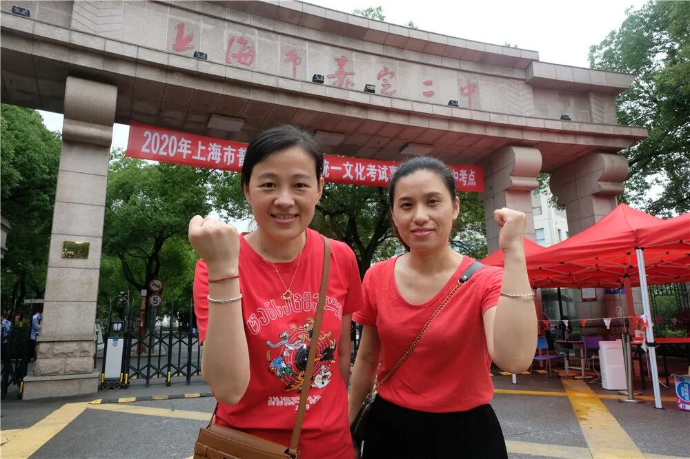 在嘉定二中考点门口,两名家长不约而同地穿上了喜庆的大红色T恤,为孩子加油鼓劲。