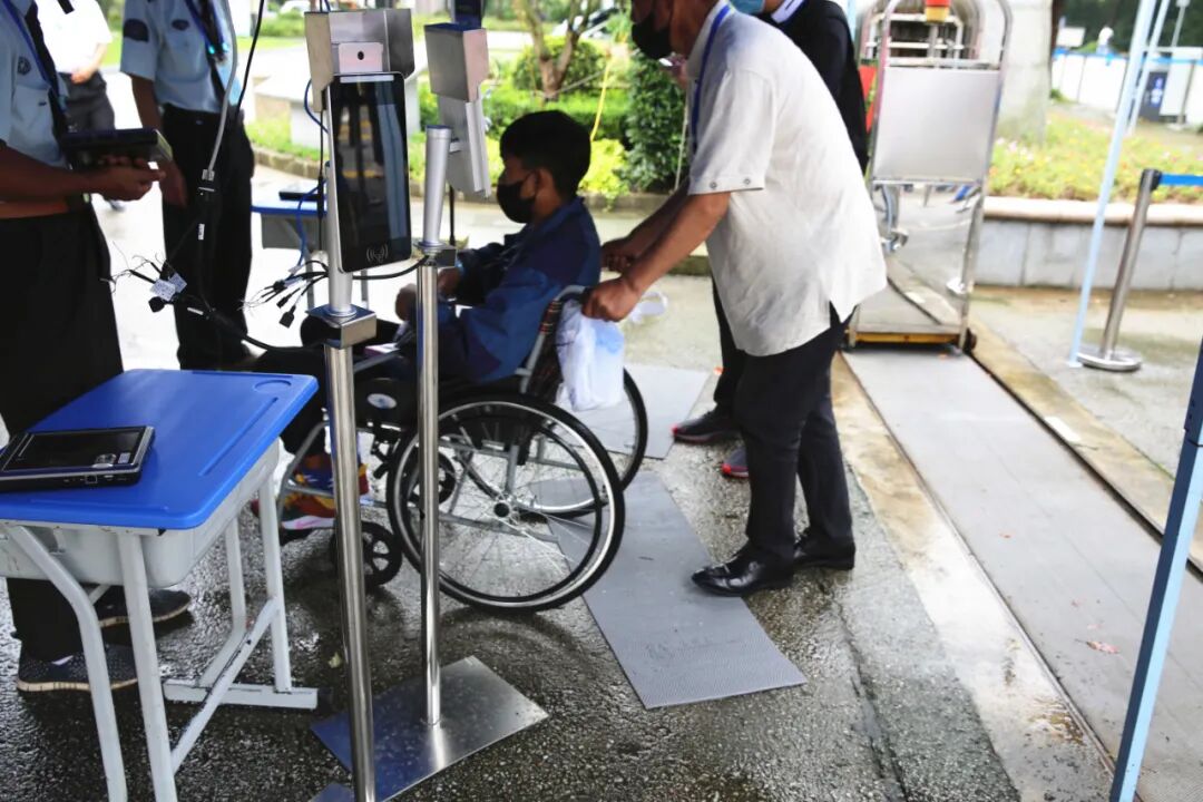 八点左右,考生开始有序入场,最后一名进场的考生有些特殊——他坐在轮椅上,身体不适仍坚持带病来考试,送考老师和校医将他送往备用考场。