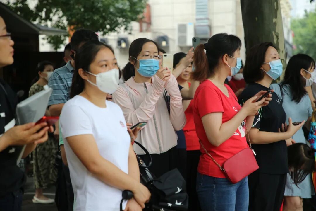 在上外嘉定实验高中考点门口,不仅有穿着橙色衣服,预祝孩子“马到成功”的爸爸,还有身着各色旗袍、祝愿考生“旗开得胜”的妈妈。今年67岁的马女士,今天就“盛装出席”,不仅穿上了大红色的旗袍,还提上了印有牡丹图案的手提包,早上6点多就来到了考点门口为孙子加油。“不仅要把好的寓意送给我的孙子,还有全国的考生,今年他们太不容易了,希望所有考生都能顺利考上理想的大学!”