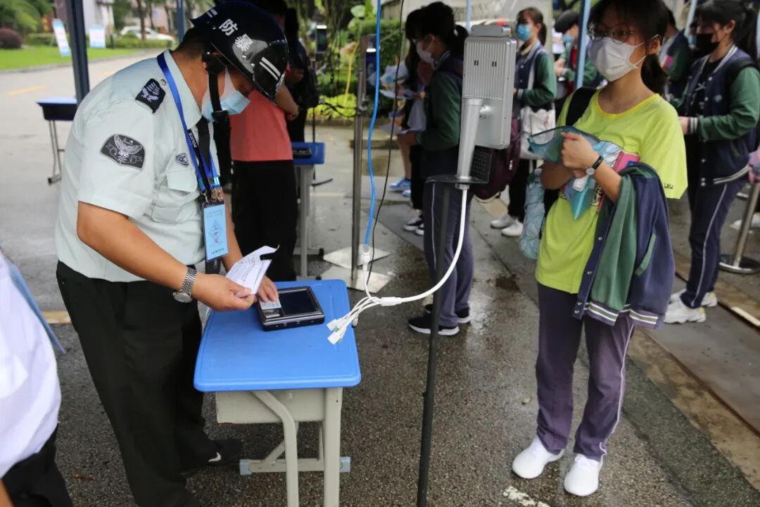 在校门口,考生们排队进入考场,家长们纷纷拿出手机,记录下这重要的一刻。