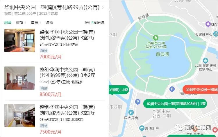 先来看看南翔乃至嘉定的标杆楼盘华润中央公园,由于是精装交付,因此整体租金也是最高的。中套租金价格大约7000-8500元/月,大平层大约在8500-12000元/月,别墅18000-30000元/月。