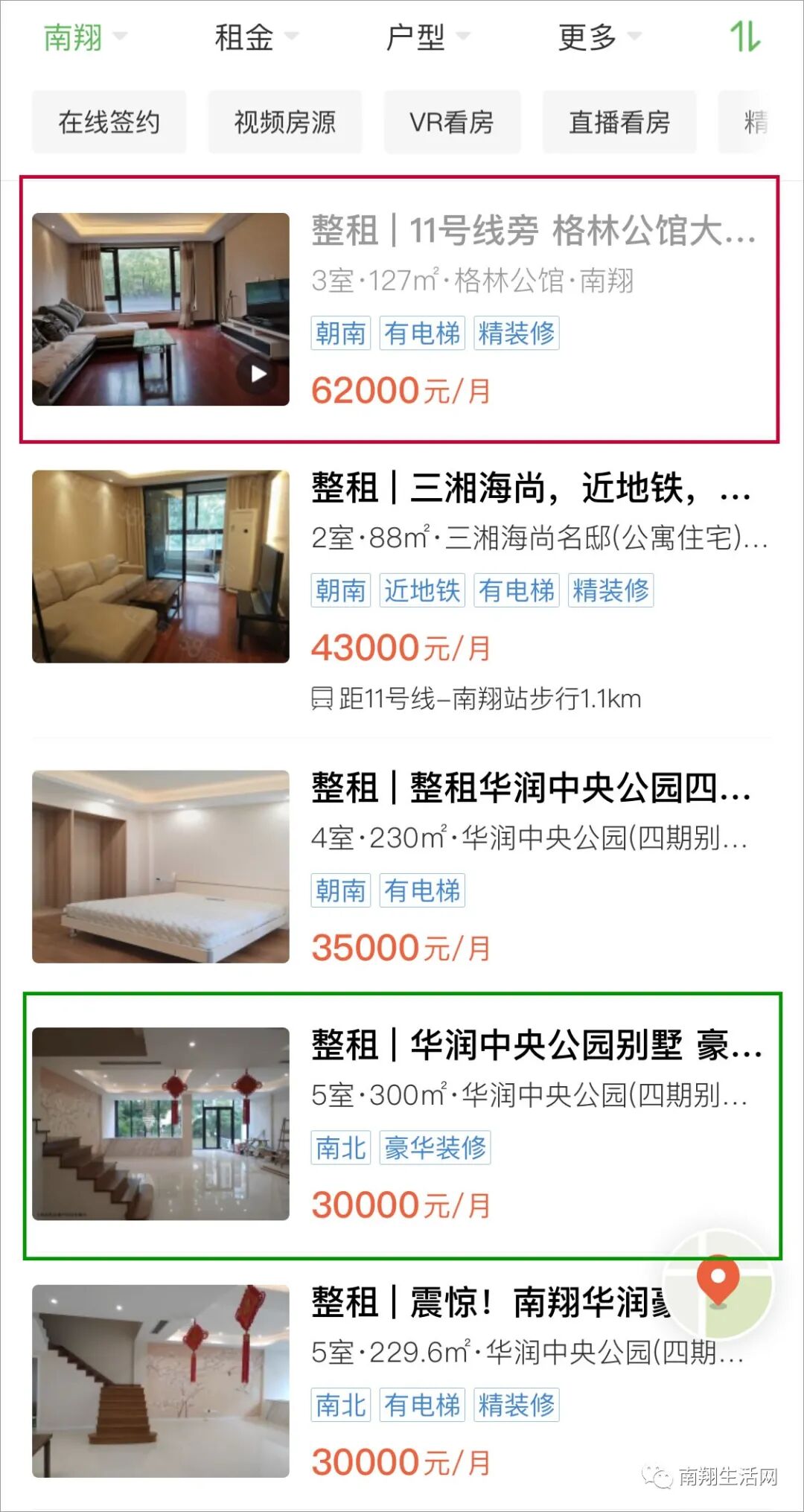 但是小编仔细一看,这个6.2万/月的格林公馆和4.3万元/月的三湘的均是2房和3房的普通房型,很明显与周边6000元-8000元的月租价格非常不相符。   因此,这个所谓南翔3房的租金高达6.2万/月,只是传说,大概率把卖房单价做成了租房单价,大家不必当真,但目前南翔房屋租金到底有波动吗?小编不做评断,先来看看第三方平台的挂牌价格。     南翔租金最贵租金有高?     除去这个明显不实际的房源价格外,从多个房屋中介APP显示情况看,华润的一套别墅房月租3万元左右的房子应该是目前最贵的,同一区间段的还有金地安布瓦湖。如果是精装别墅,这个价格也算说的过去。