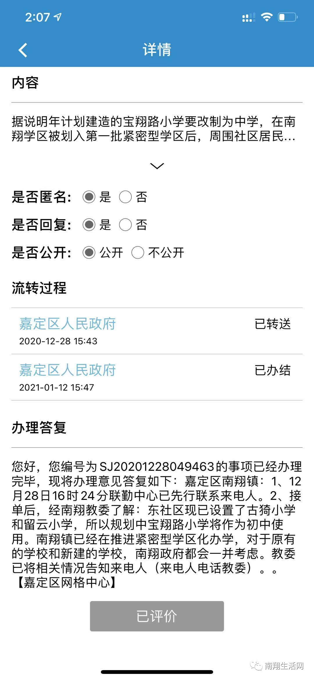 据后台网友@Jack爆料,在去年12月18日向嘉定区人民政府提问的关于“宝翔路小学是否改制为中学”的问题,在今年1月12日得到了嘉定区政府的答复。