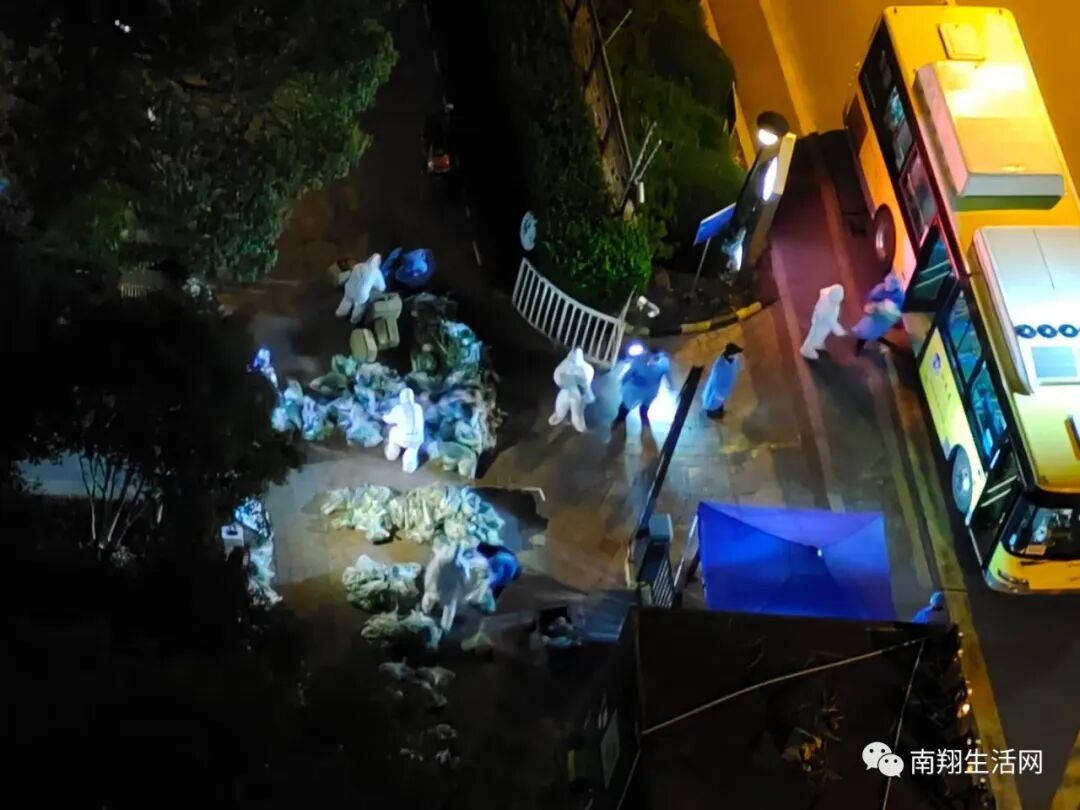 为了让嘉定居民尽早拿到物资包,直到深夜,运输志愿者和社区志愿者们还在将整车物资接龙式运入社区。