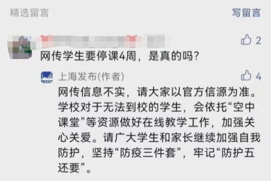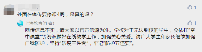 上海发布今天晚间予以澄清:信息不实。请市民以官方信源为准。学校对于无法到校的学生,会依托“空中课堂”等资源做好在线教学工作,加强关心关爱。也请广大学生和家长继续加强自我防护,坚持“防疫三件套”,牢记“防护五还要”。