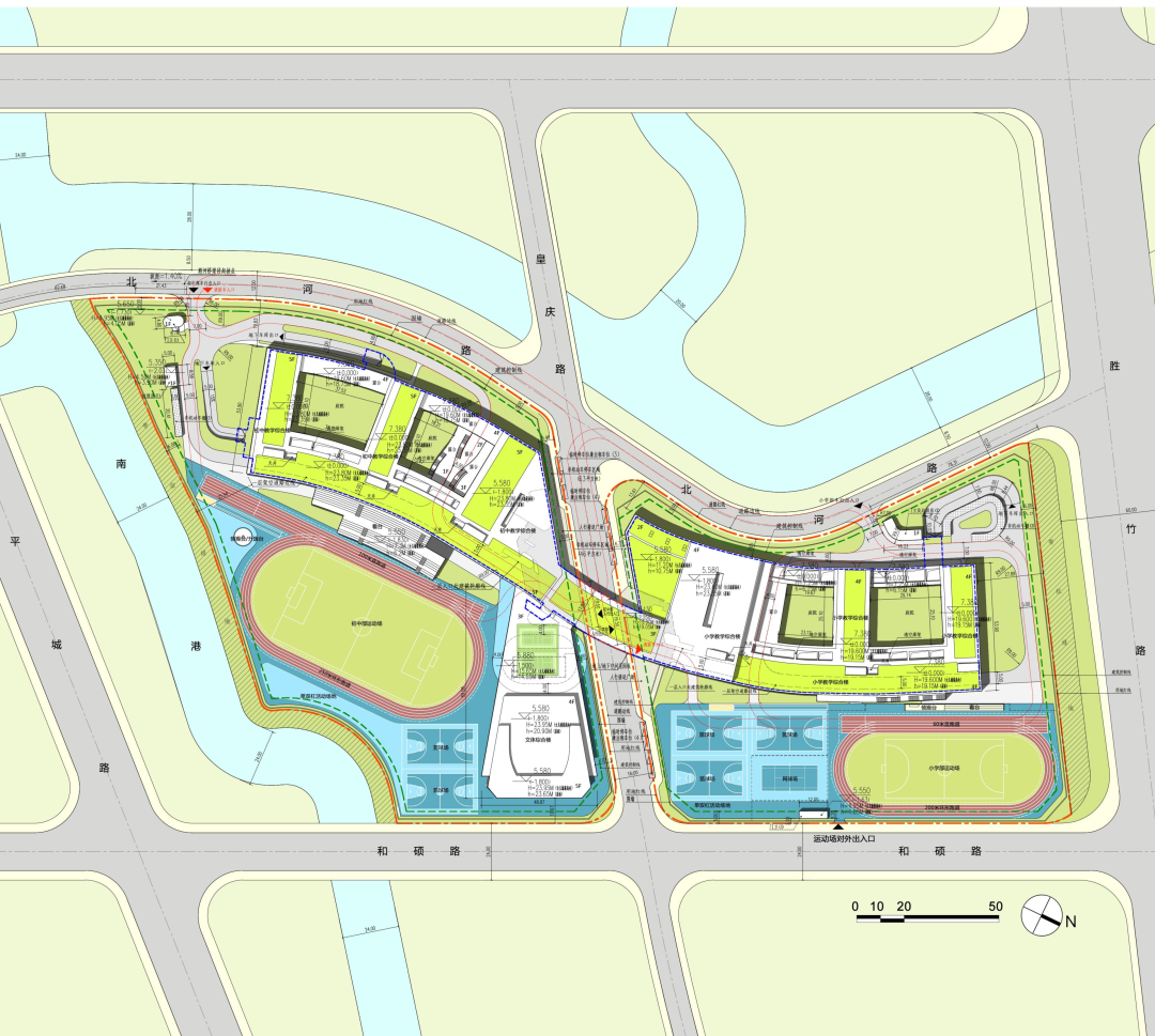 建筑规划方案顺应基地边界形态,将小学、初中教学综合楼分置两侧地块,并通过皇庆路上部的公共通道连通,南地块东侧布置文体综合楼。     1. 小学教学综合楼:包括小学普通班教室、学习中心、专业教室、学生餐厅、教师办公室;   2. 初中教学综合楼:包括初中普通班教室、学习中心、专业教室、教师办公室,文体综合楼包括室内体育馆、报告厅、观众厅。   本项目在南北地块设置一层地下室,并通过皇庆路下方的连通道相连,包含学生餐厅、教学辅助用房、机动车停车库。   小学部和初中部分别设置垃圾房及非机动车停车棚一处,面积均满足要求。   室外运动场地布置于两幅用地东侧  小学部 设置1个运动场、3片篮球场、1片网球场,围绕小学部运动场设置200米环形跑道和60米直跑道。    初中部 设置1个运动场、2片篮球场,围统初中部运动场设置250米环形跑道和100米直跑道。在文体综合楼3层屋顶平台设置2片室外羽毛球场。