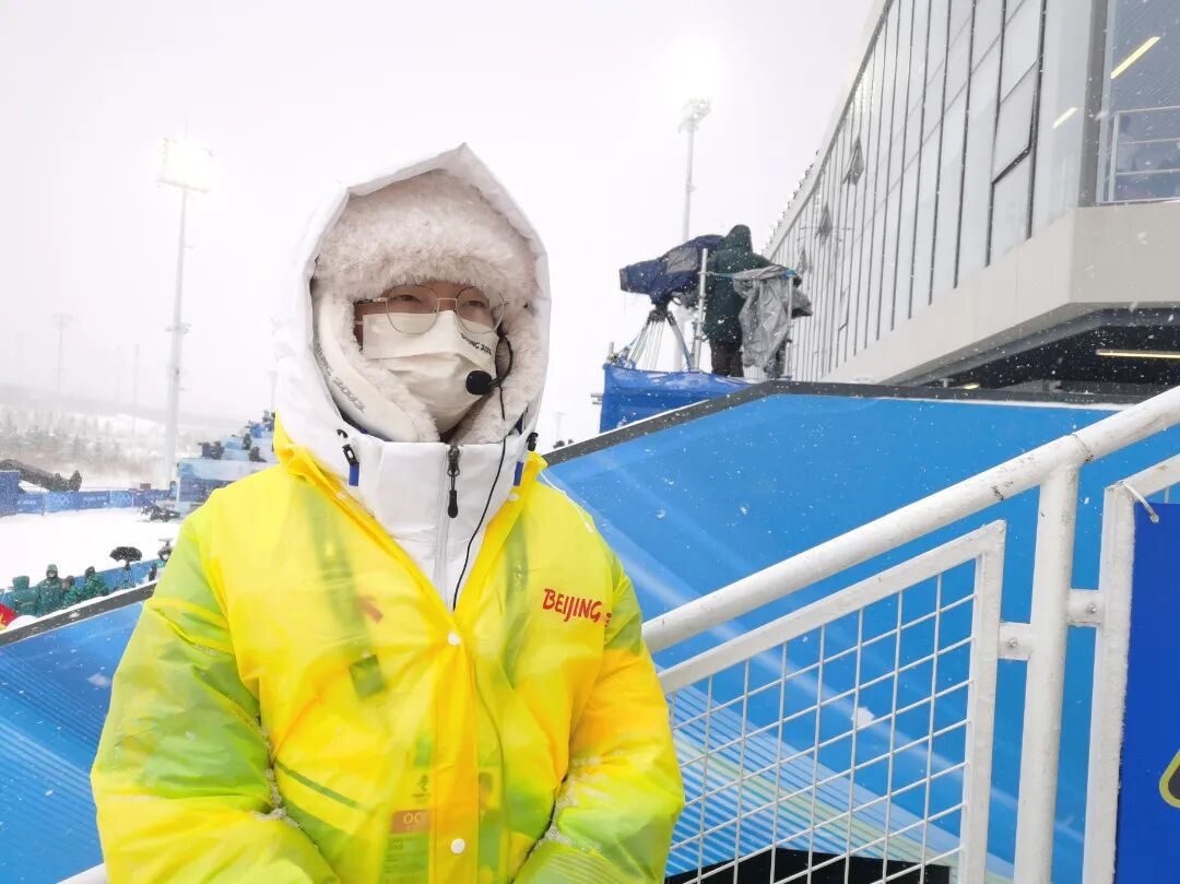 在看台的工作岗位上,他要时刻面向观众,直面风雪。有时进行晚上的比赛,室外温度会降到零下二十多度,每呼一次气,口罩里扑腾而出的热气便会升到眼镜片上,结出一层冰晶,透过镜片便是雾蒙蒙一片。他需要努力睁大眼睛并控制呼吸频率,注视着看台区,为观众提供最及时的服务,让看台区的引导管理工作良好运转下去。