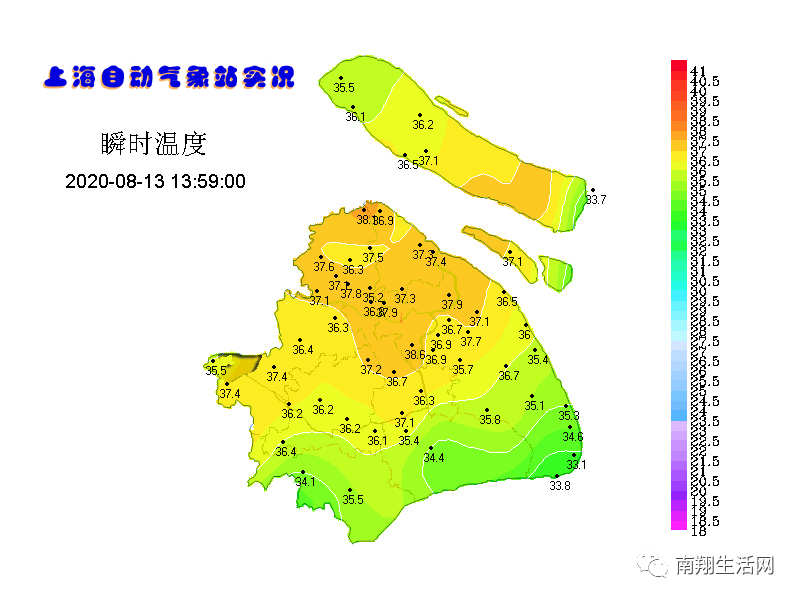 根据上海自动气象站实况信息,今日中午13:59分,嘉定华亭的实时气温竟然已经到达38.1度!
