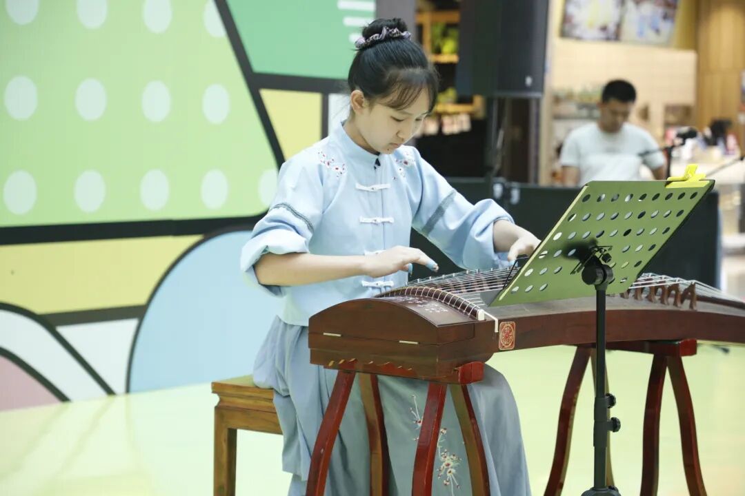 古风装的小妹妹用古筝弹奏着乐曲,下面的宝宝也在认真的欣赏着。