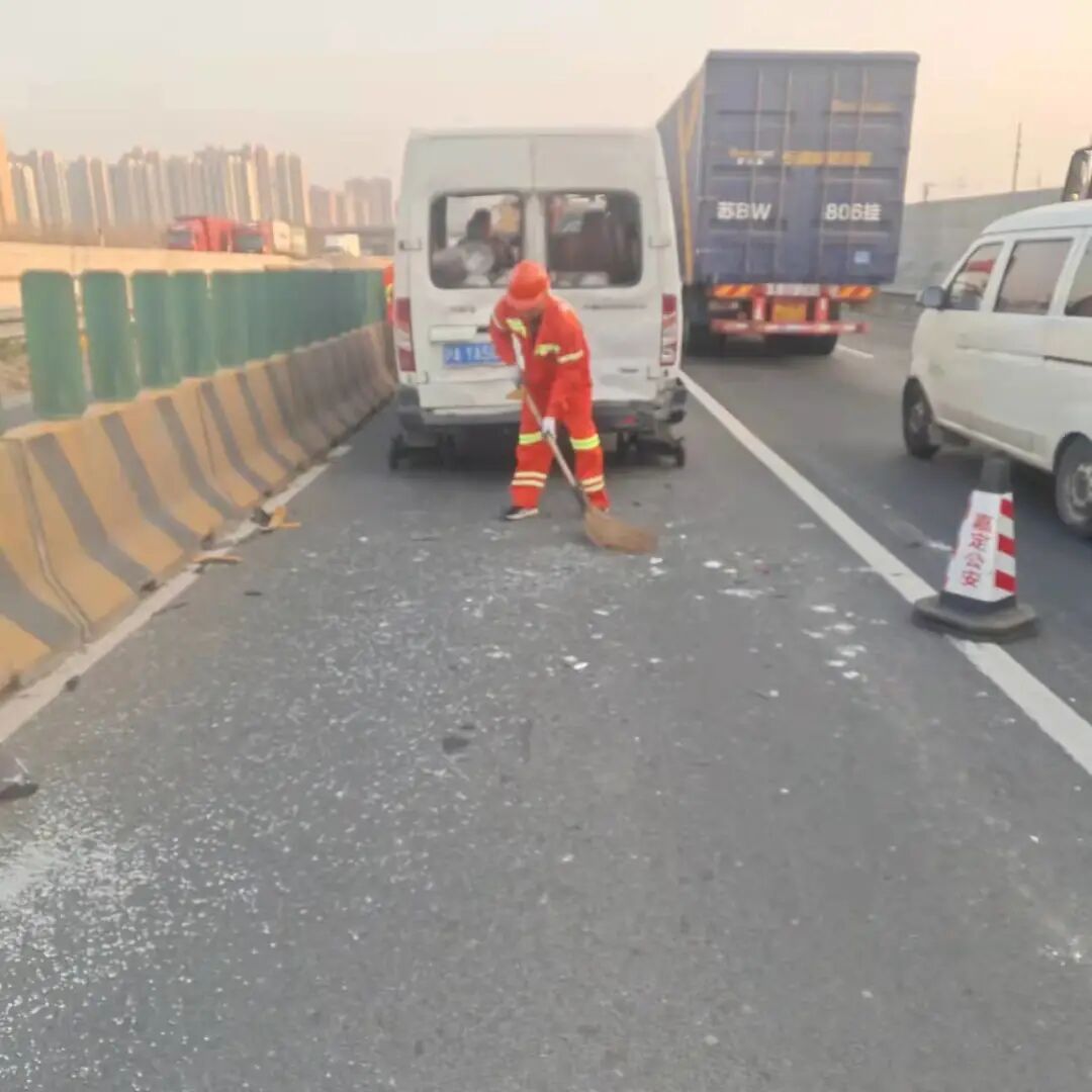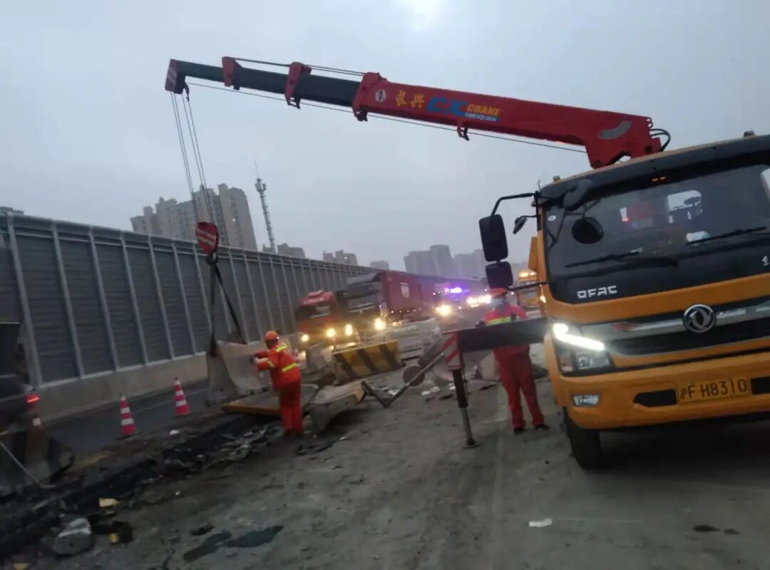 全线牵引车共投入了11辆,在重要节点都是24小时待命,40人左右的应急保障队伍,全力做到交通事故最快处置,保证第一时间发现,第一时间到位,第一时间处置。