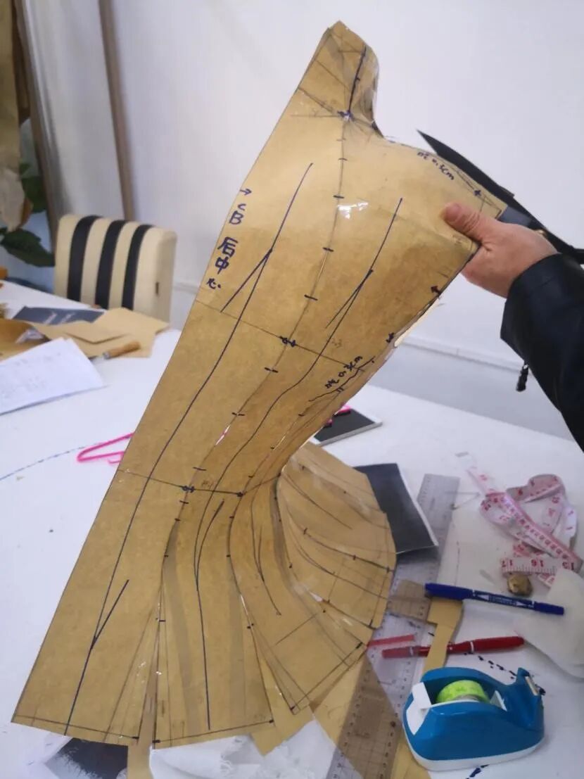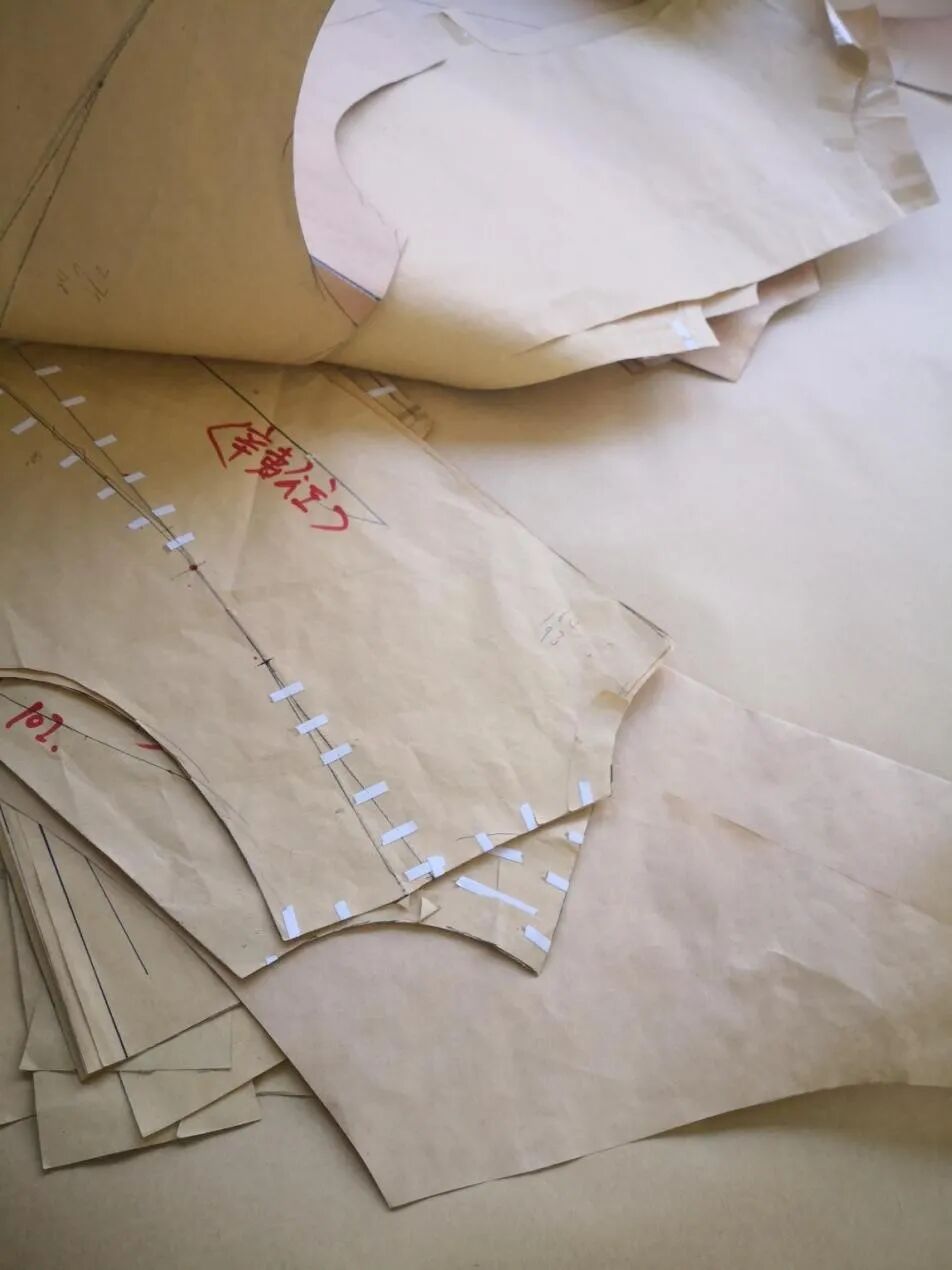 设计师们在演员出发之前大体量好身长和三围尺寸,按照这个数据将刻度标注于人台上,之后用牛皮纸裁剪成纸样。在大体的方案确定后,制版师们再用普通布料一块块的替换成白模样衣。在裁剪最终材料之前,服装团队需要在白模阶段确保每一个细节的造型和修改不会影响到演员的动作呈现,因此在每一件白模的每一次细微调整之后,设计师都要将服装快递到上海让演员试穿,进行视频交流,确定后再由上海发回工厂,开始最终选材。
