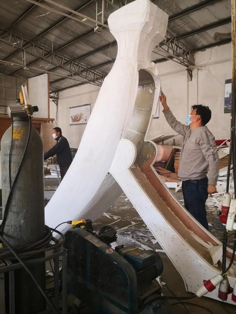 这种多变设计对于制作、现场,以及灯光都提出了较高的要求。车间内,制景和绘景老师们正在紧锣密鼓地工作着。为了保证舞台呈现时的安全,他们将钢架结构不断进行切割重组,确保每一处连接点的稳定性和拆卸的便利性。榫卯式钢架结构确定之后,他们在造型面上添加木板和苯板来塑造造型,用不停地胶合与打磨来修饰细节。