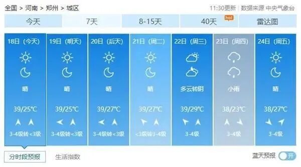 6月16日,河南省会郑州市出现了今年全国省会级城市中首个40℃+,并且刷新当地6月最低气温最高值。气象分析表示,河南此轮高温天气超长待机,比如郑州,未来一周高温将天天见,38℃以上热浪或连续5天在线此外,洛阳、商丘、开封等地高温也将持续6天左右。