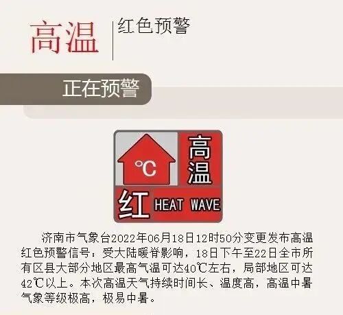 济南市气象台在昨天中午12时50分变更发布高温红色预警信号:受大陆暖脊影响,18日下午至22日全市所有区县大部分地区最高气温可达40℃左右,局部地区可达42℃以上。本次高温天气持续时间长、温度高,高温中暑气象等级极高,极易中暑。