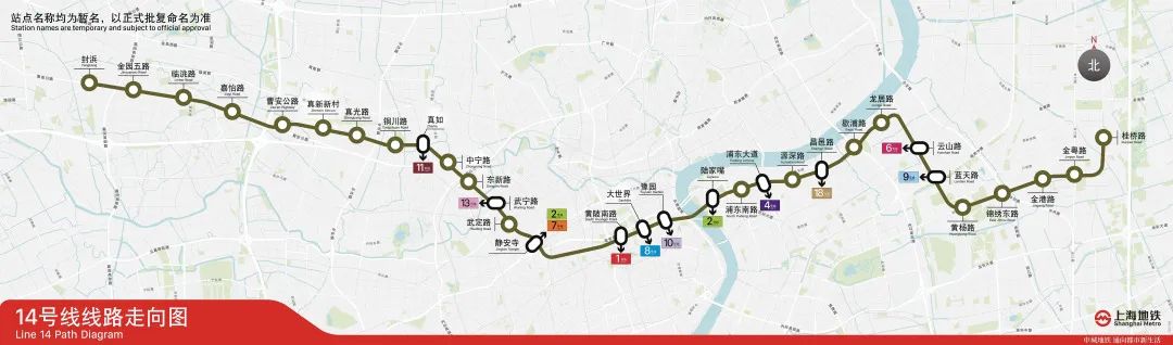 14号线路起于嘉定封浜站,止于金桥桂桥路站。线路经过嘉定区、普陀区、静安区、黄浦区、浦东新区 5个行政区,线路全长 39公里,共设31座车站,全线为地下线路。