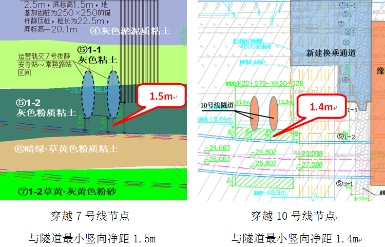 此次两项穿越同时进行,隧道顶覆土埋深26.8米,与运营隧道最小竖向净距仅1.4米,14号线盾构前期曾发生渗漏水,且近期遇到施工现场出土难等情况,穿越施工风险大、时间紧、任务重。前期,申通地铁集团建管中心、监护办、14号线项目公司和施工单位多次讨论,深化施工方案、完善应急预案、落实应急物资,确保穿越顺利进行。
