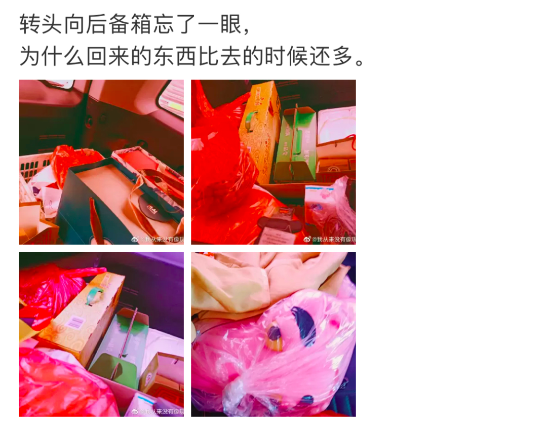 分享了自己返程的后备箱视频