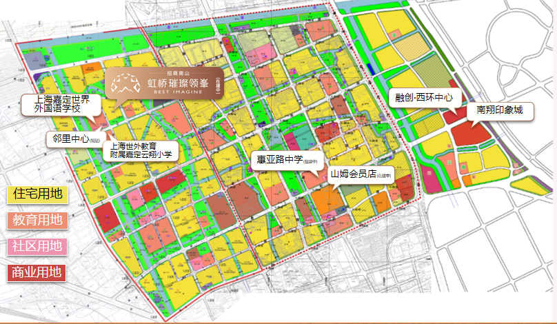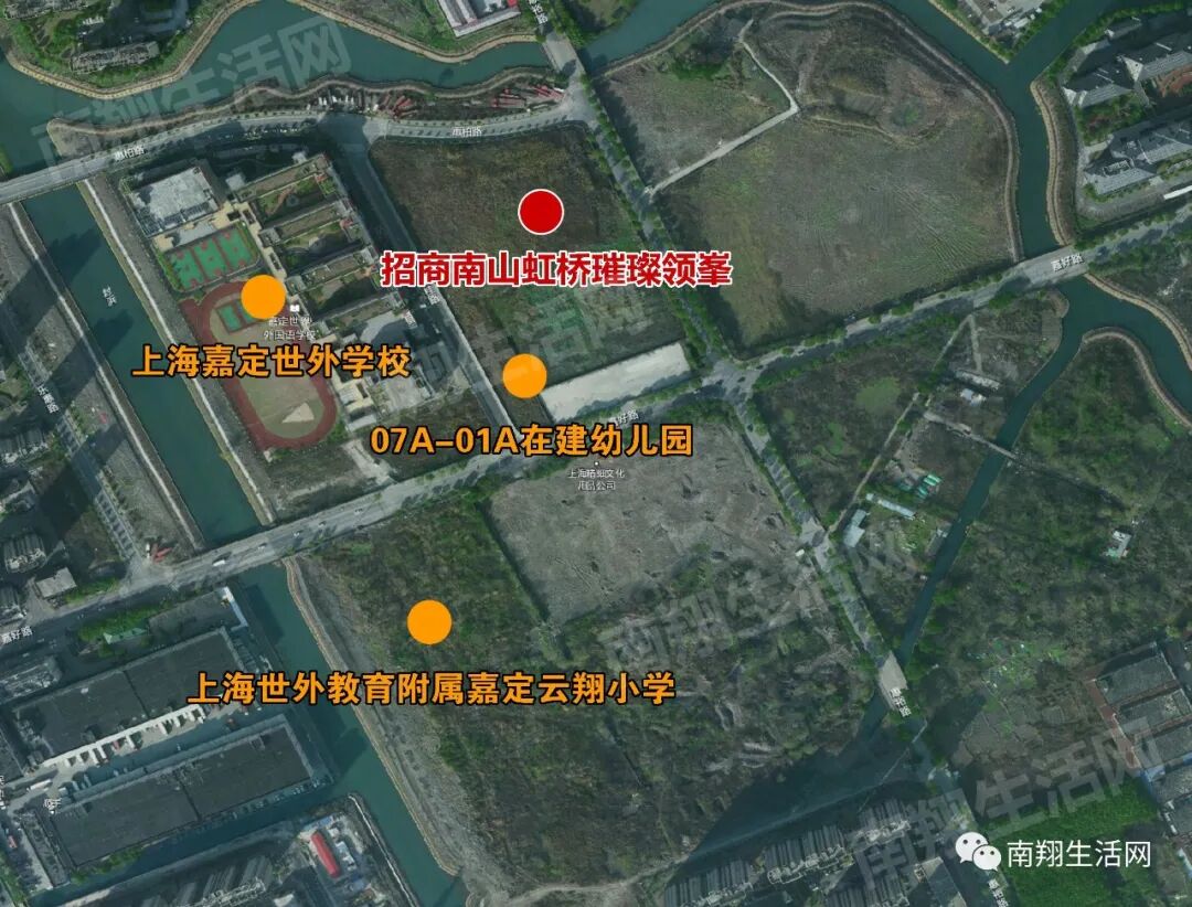 以下这张图,看看招商南山虹桥璀璨领峯与上海嘉定世外学校、上海世外教育附属嘉定云翔小学、在建的幼儿园的位置关系。