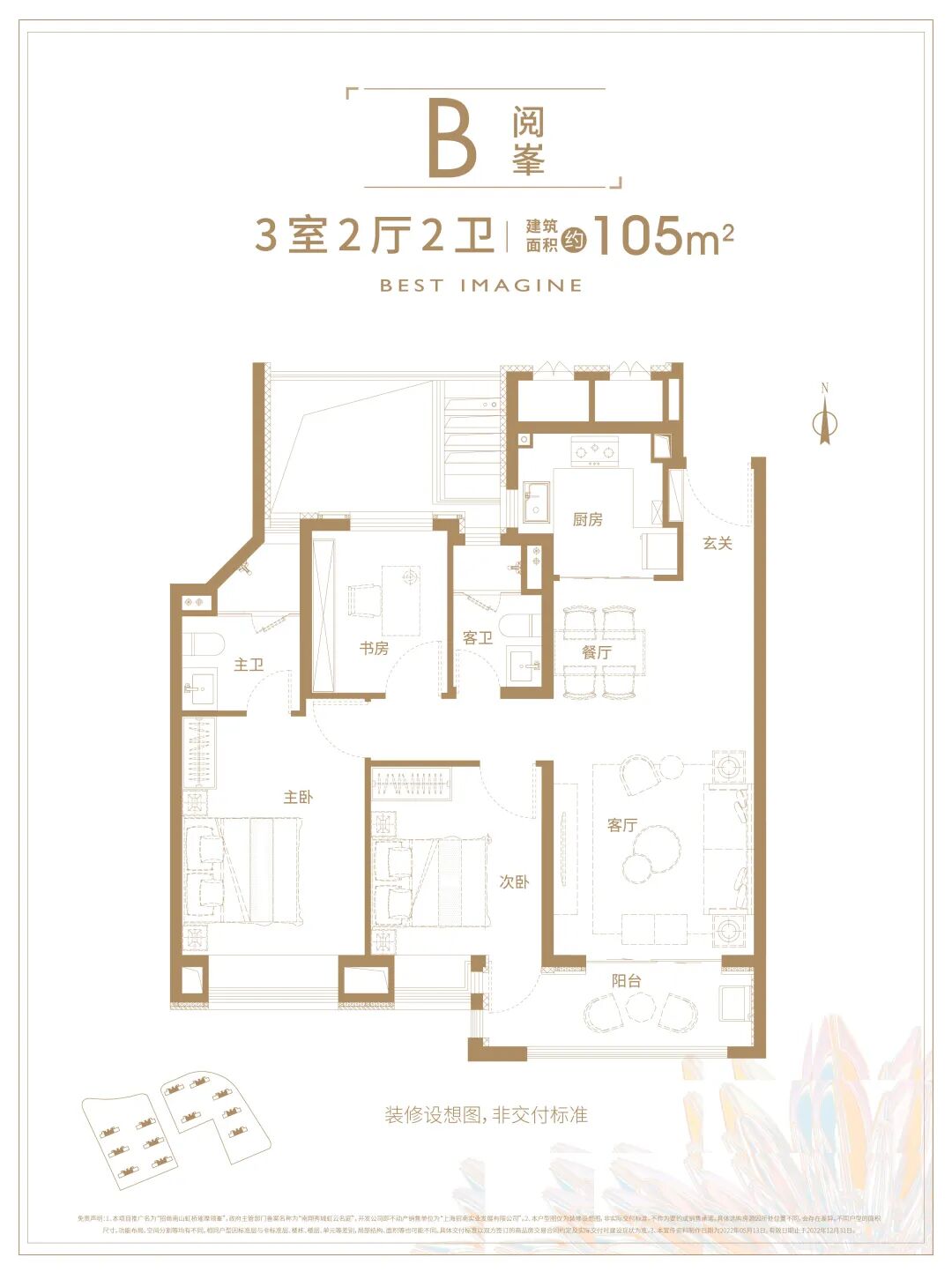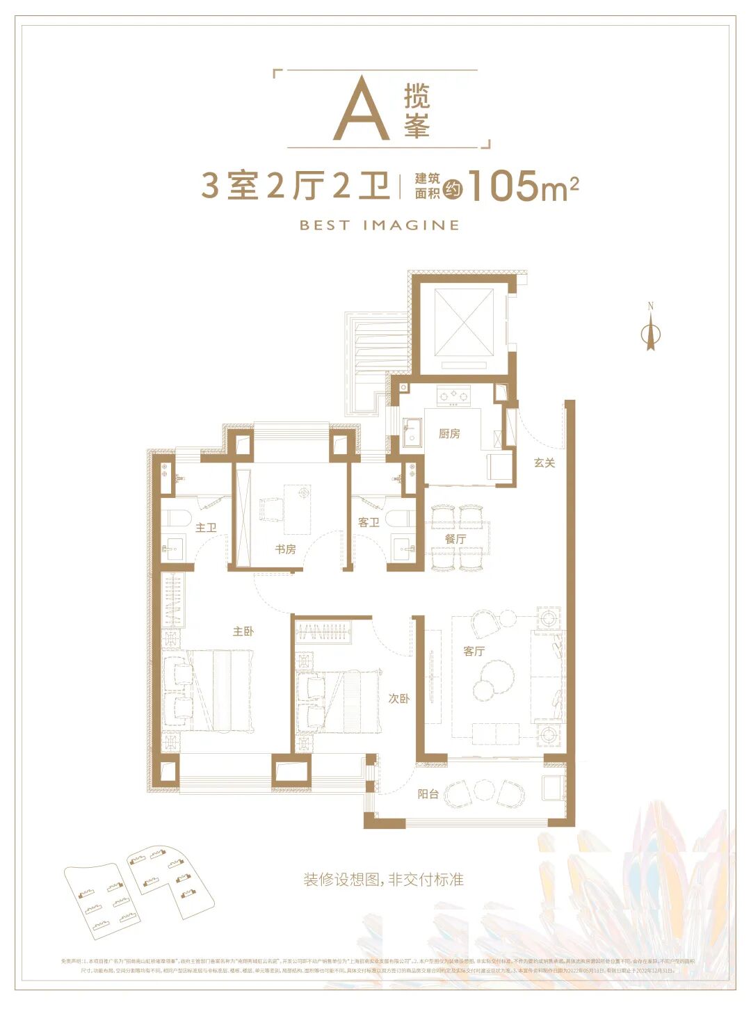 建面约105㎡三房两厅两卫,两个卧室朝南,客厅朝南,三开间朝南的方正格局,这个户型也许能让更多人重新发现3房的价值。