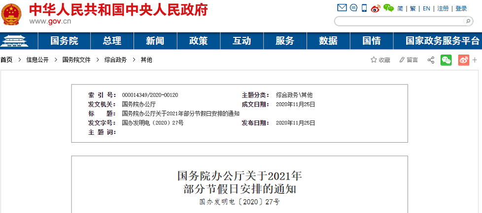 近日,国务院办公厅印发《关于2021年部分节假日安排的通知》。2021年元旦、春节、清明节、劳动节、端午节、中秋节和国庆节放假调休日期的具体安排通知如下: