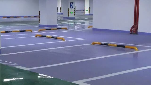 走进车库内部,各个区域用紫色、黄色和红色区分,地面上还划出了绿色的行人通行区域和人行横道线来保障车内人员下车后的通行安全。