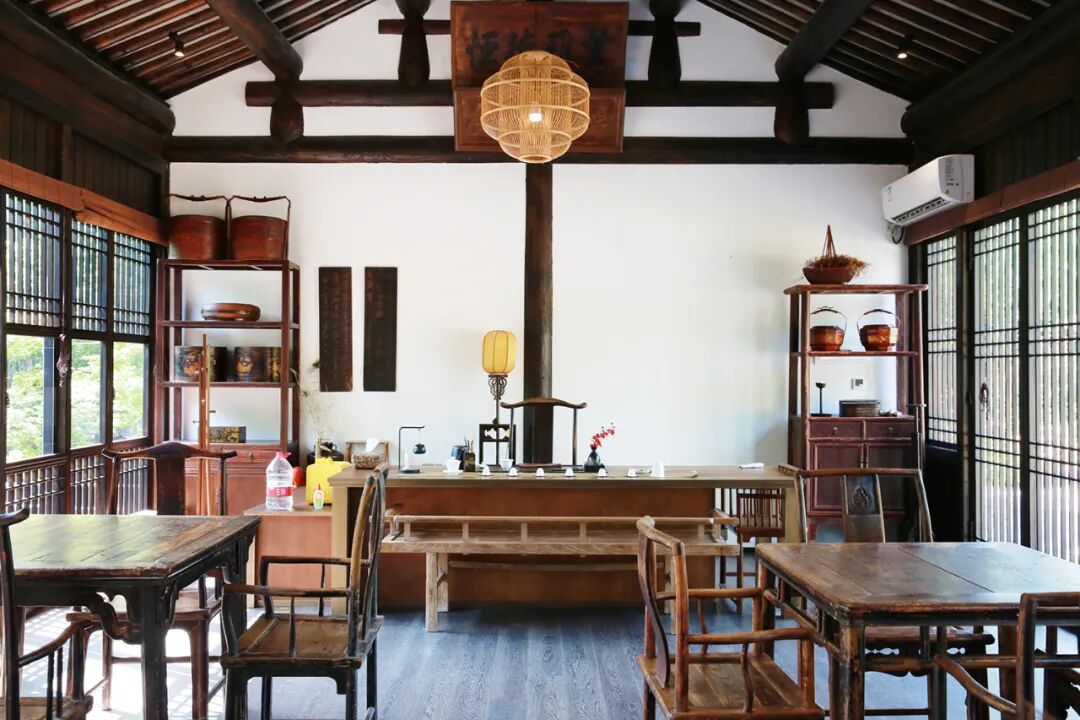 走进三座小茅屋包间以及大茅屋大厅,可以看到茶室清雅,木制家具,古色古香。