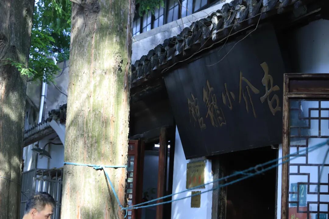 吾介小笼馆,既是小笼馆,也是茶馆。大堂侧门刻着五只蝙蝠,寓意五福临门,店内的摆设也很有讲究,木质桌椅配以镂空雕花,还有明代朝服架、面盆架,抬头一看,还有一处小天窗。