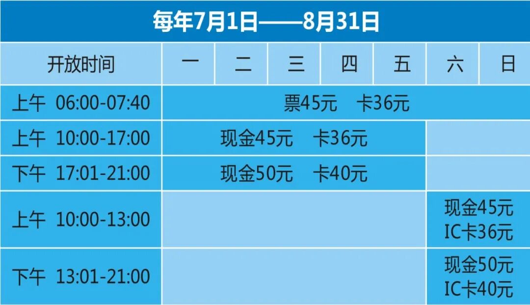 地址:新成路118号 开放时间: 7月1日-8月31日 10:00-21:00 9月1日-次年6月30日 周一至周五 17:00-21:00;周末13:00-21:00 收费标准:年卡2600元或按次收费,详情见下表(表中卡为次卡)