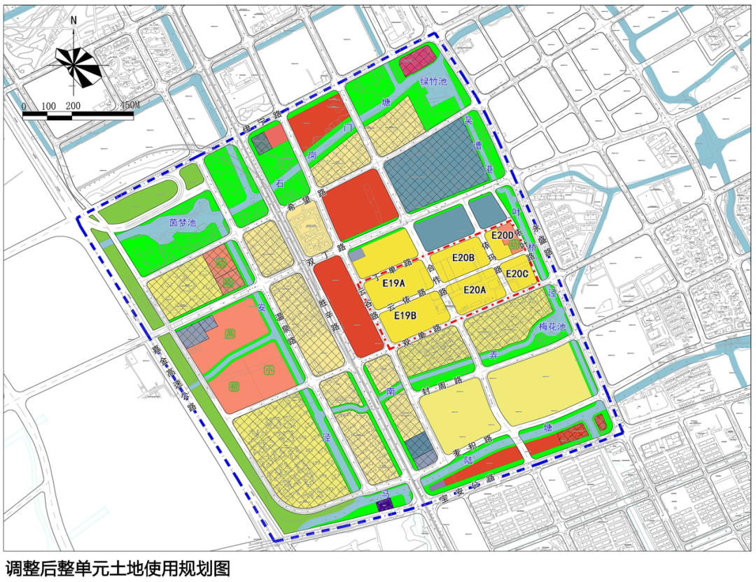 2.用地性质:为形成复合功能的活力街区,规划范围内E19A-1、E19B-1、E20A-3地块用地性质为商业商办住宅混合用地;E20B-1地块用地性质为商业住宅混合用地;E20C-1、E20D-3地块用地性质为三类住宅组团用地;E20D-2地块用地性质为基础教育设施用地。