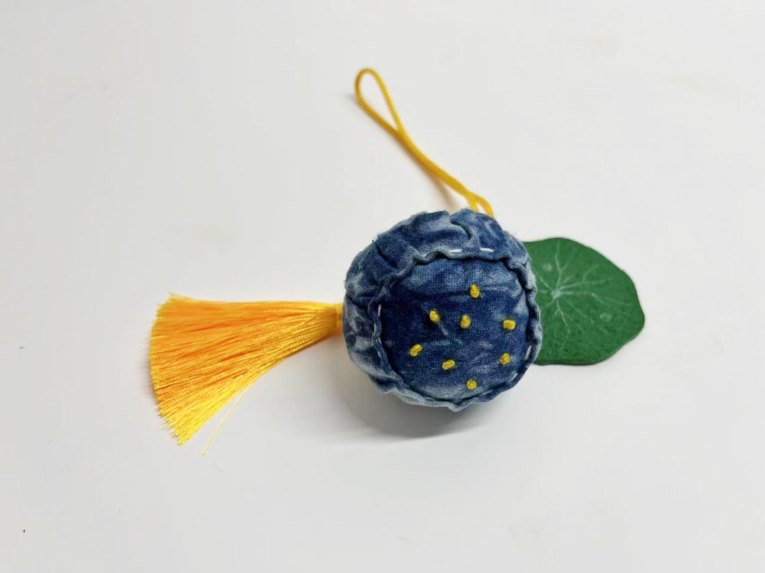 (2)分发材料包给予参与课堂的学员,一块圆形布料通过缝线,填充艾草等简单操作就可以做成一个可爱的莲蓬香囊,并且能学到刺绣针法—打籽绣,使用手工扎染棉布制作。教师手把手指导完成手中的扎染莲蓬作品。