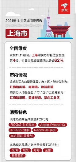南翔生活网刚刚据上海热线消息:2021年京东11.11期间,上海购买力强劲,排名位居全国第4位,11日当天成交额环比增长62%。  根据配发的京东双11区域消费报告,南翔镇购买力总量高居全上海第二!