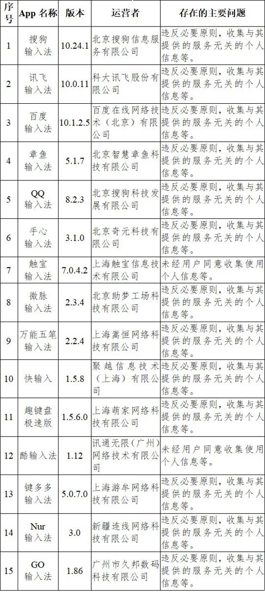 据此前报道,5月1日,国家网信办官网发布关于输入法等33款App违法违规收集使用个人信息情况的通报。其中搜狗、讯飞、百度、QQ输入法均榜上有名。