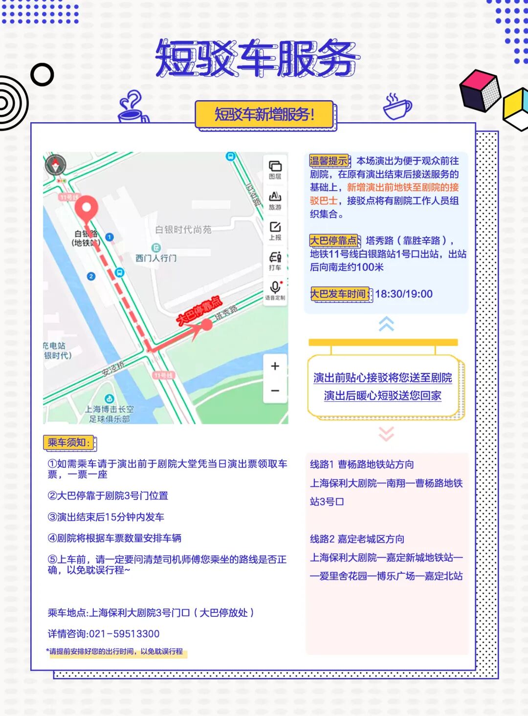 售票热线:021-59513300 营业时间:9:00-17:30(无演出) 营业时间:9:00-21:00(有演出) 剧院地址:上海市嘉定区白银路159号 剧院官网:www.shpgt.com