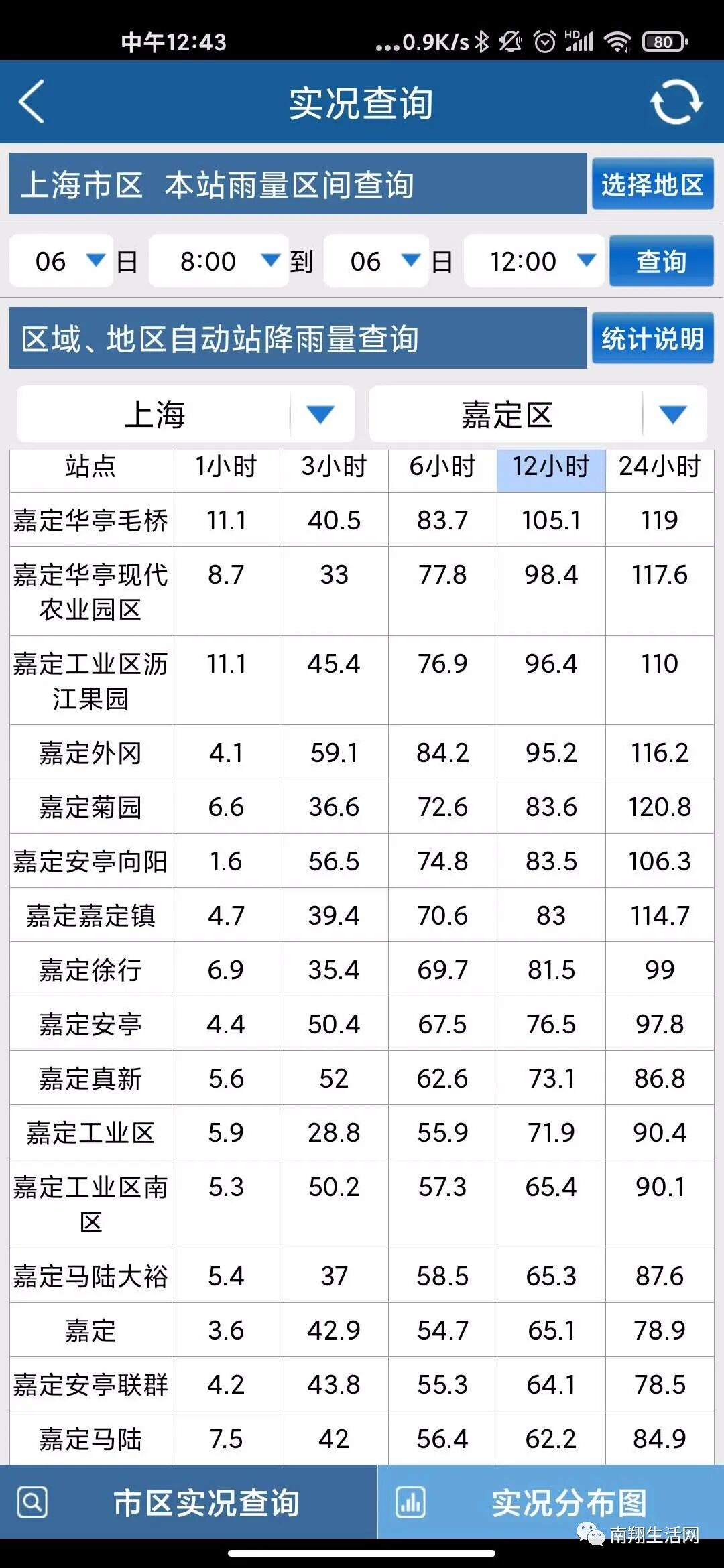 通过实时查询,嘉定区各街镇降雨量均值在100ml左右,其中以菊园为最达到120.8ml,路面积水问题已逐渐出现,大家出行的时候要注意安全哦,同时也别忘记带好雨具。