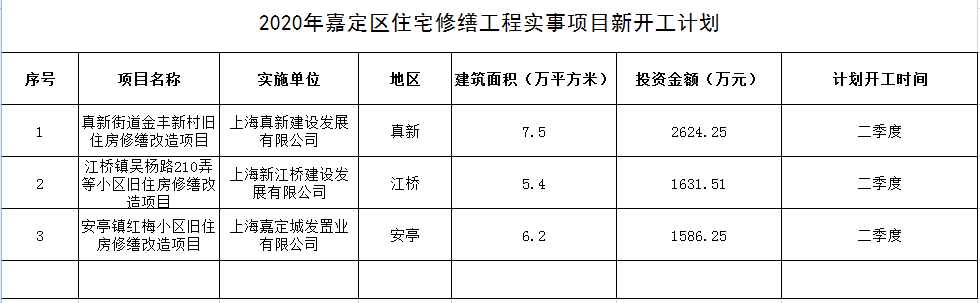 根据嘉定区政府年初排定的计划,2020年对真新街道金丰新村、江桥镇吴杨路210弄小区、安亭镇红梅小区等3个小区实施综合改造,总改造面积约19.12万平方米,总计投入改造资金约5841万元,共惠及3095户居民。综合改造完成后,居民居住条件和环境将大大改善,广大群众的获得感和满意度也将进一步得到提升。