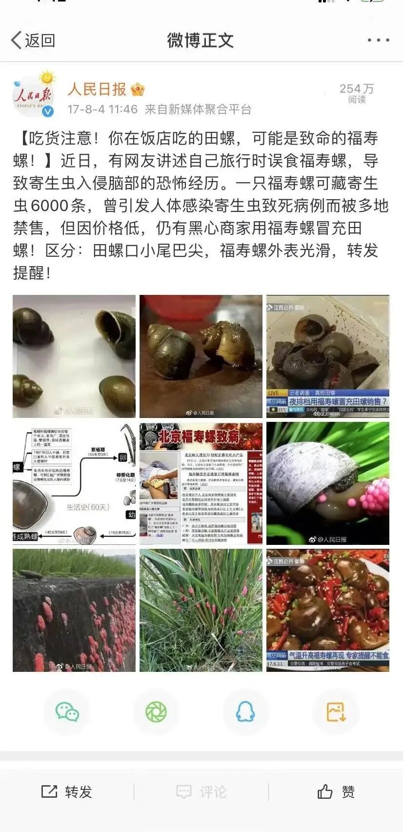 福寿螺外观与我们常见的田螺相似,但形状、颜色、大小有差异↓