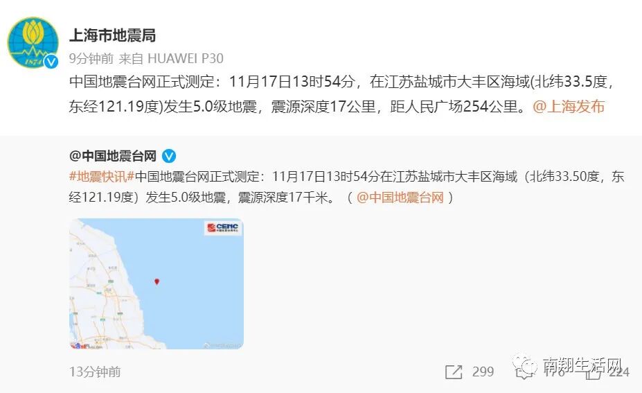 刚刚!南翔生活网从中国地震台网获悉:正式测定:11月17日13时54分,在江苏盐城市大丰区海域(北纬33.5度,东经121.19度)发生5.0级地震,震源深度17公里,距人民广场254公里。