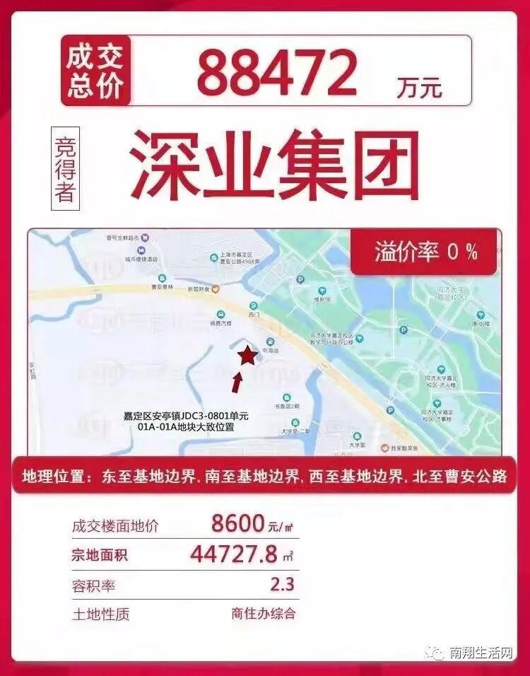 安亭镇JDC3-0801单元01A-01A地块,被深业以8.8472亿元底价拿下。