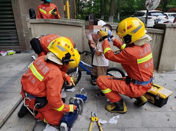 前日,嘉定区消防救援支队接到一名家长报警,称南翔镇德园路某小区内,一名男童在骑车时,不慎将脚卡住。事发后,消防队员赶赴现场施救,最终化险为夷。  消防队员抵达现场时,发现男童的右脚被卡在了小型自行车踏板传动轴与车身之间。家长表示,在几经尝试,试图帮助孩子将脚拔出无果后,才选择报警求助的。消防队员一边安抚孩子,一边疏散围观居民,在施救过程中,一名消防员还贴心地用毛巾捂住男童的眼睛,避免救援时,男童因害怕导致情绪波动,从而影响救援。     随后,另一名消防队员操作液压钳,撑开自行车踏板,扩大踏板传动轴与车身之间的空隙,很快帮助男童脱困,所幸男童的脚并无大碍。