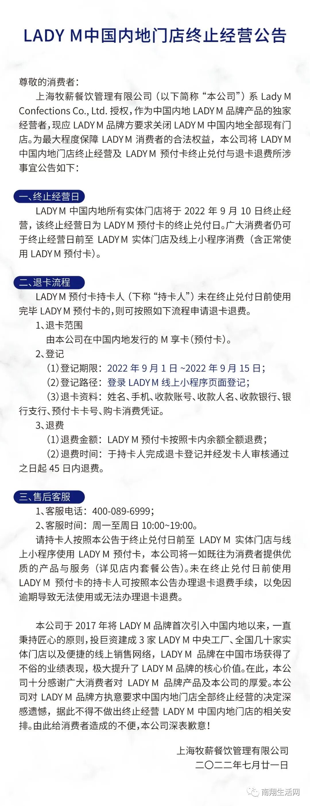 南翔生活网今日中午从“LadyM内地官方”微信公众号获悉,7月21日,上海牧薪餐饮管理有限公司发布LADY M中国内地门店终止经营公告。LADY M中国内地所有实体门店将于9月10日终止经营,该终止经营日为LADY M预付卡的终止兑付日。消费者仍可于终止经营日前至LADY M实体门店及线上小程序消费(含正常使用LADYM预付卡)。