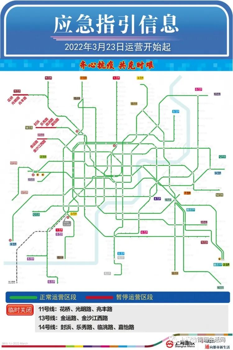为配合疫情防控工作需要,2022年3月23日运营开始起至另有通知时止,暂停上海轨道交通13号线金运路站、金沙江西路站和14号线封浜站、乐秀路站、临洮路站、嘉怡路站运营服务,13号线、14号线其他车站仍维持正常运营,请乘客留意。