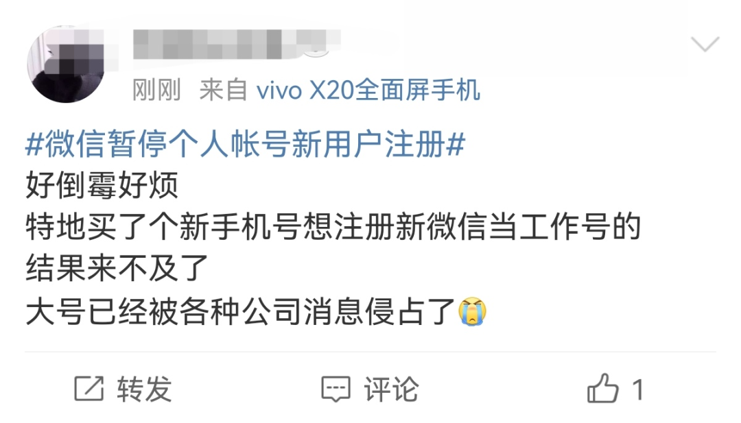 7月27日上午消息,网传截图显示,微信暂停个人帐号新用户注册,直至8月初才能恢复注册。