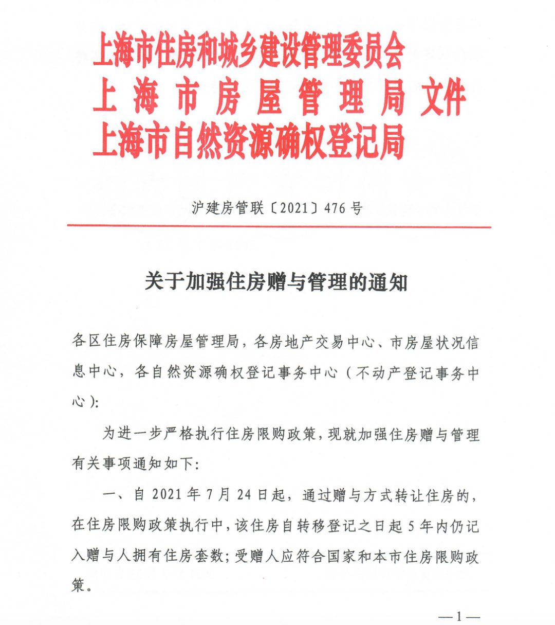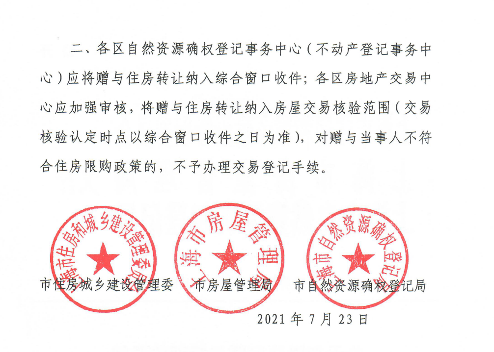新规明确,自2021年7月24日起,通过赠与方式转让住房的,在住房限购政策执行中,该住房自转移登记之日起5年内仍记入赠与人拥有住房套数;受赠人应符合国家和本市住房限购政策。