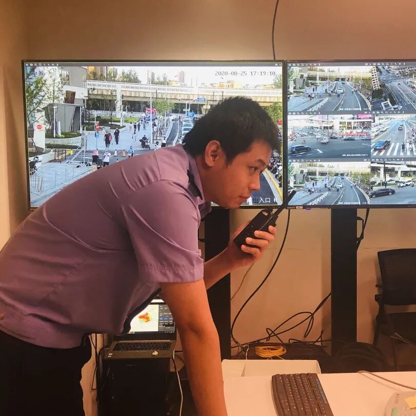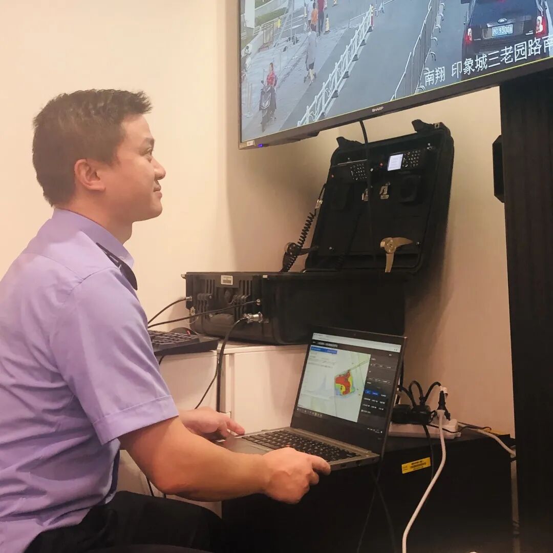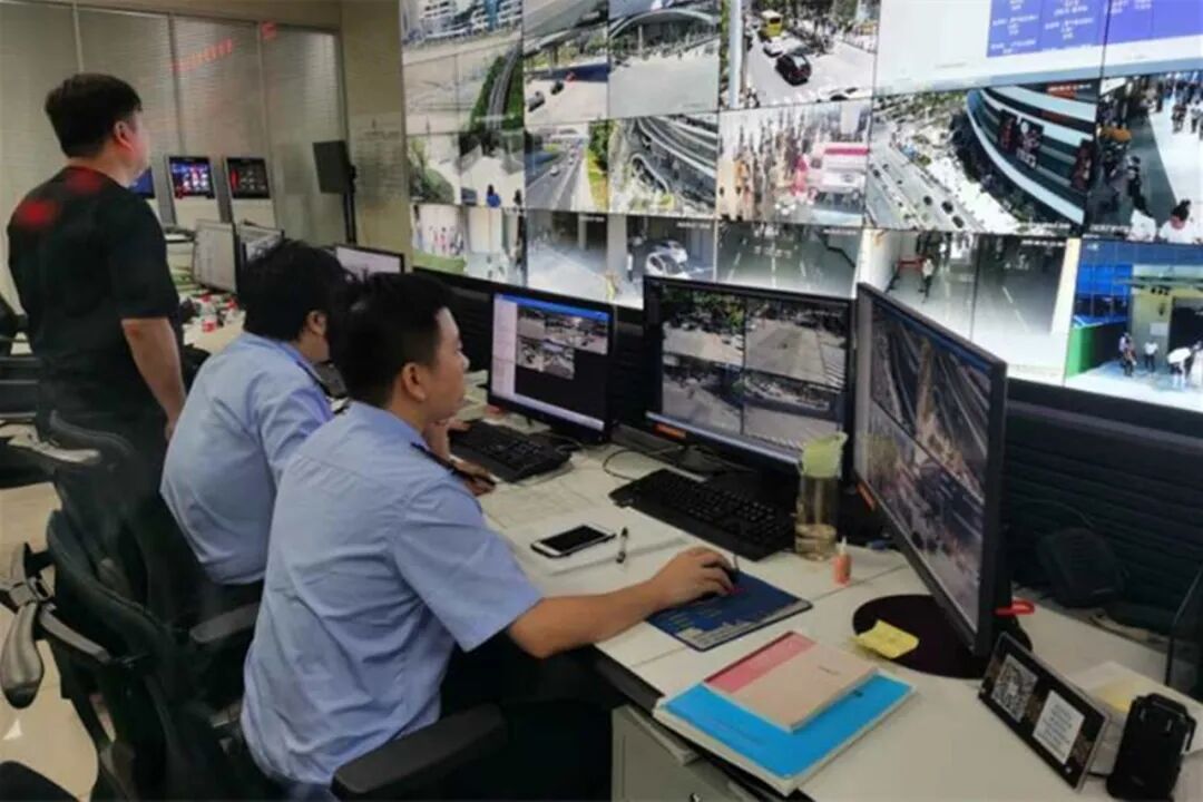 ▲ 民警在综合指挥室通过视频监控实时查看周边车流人流情况。