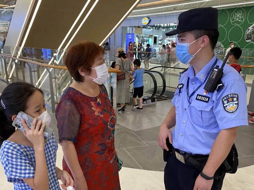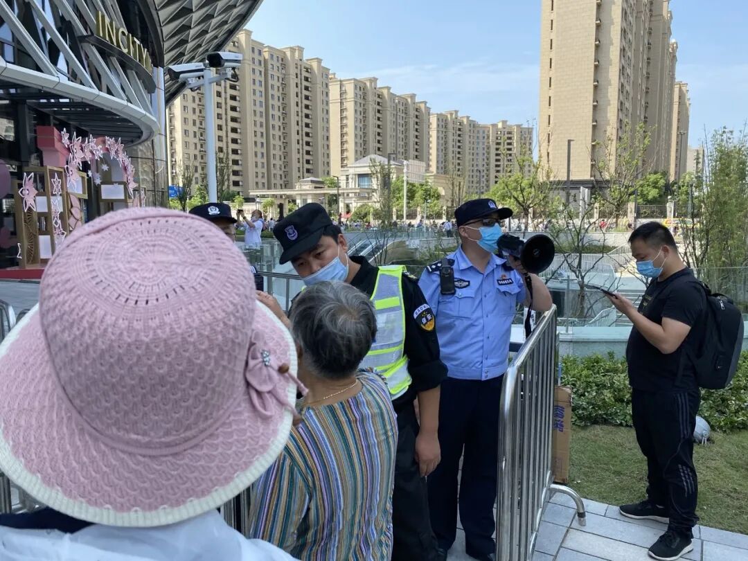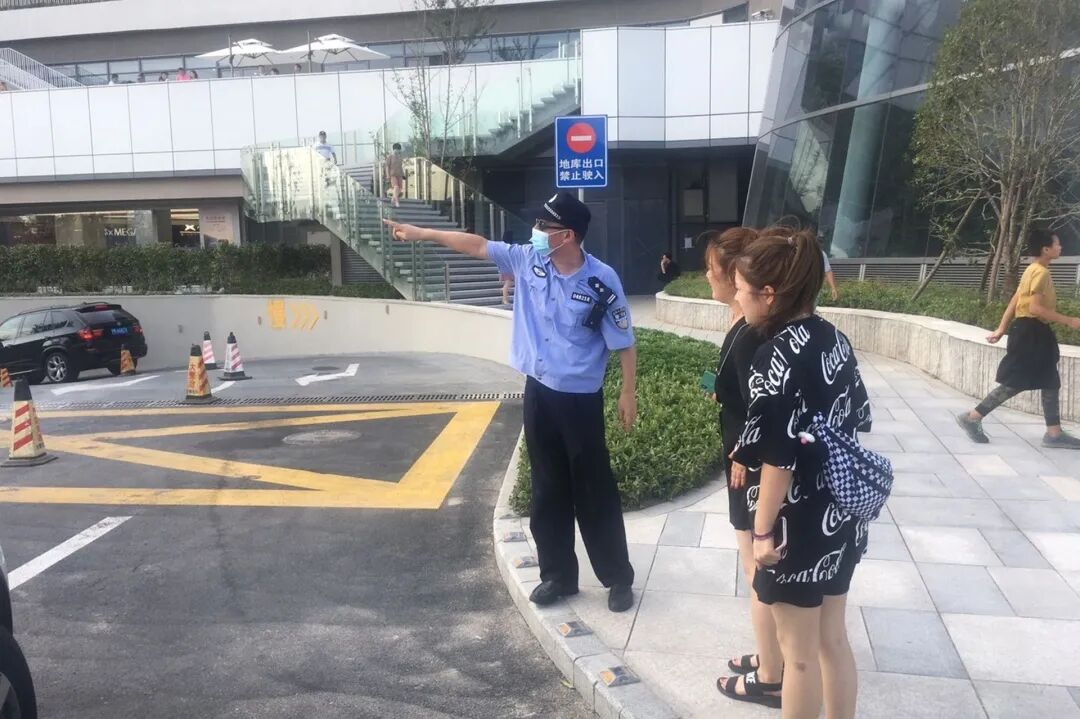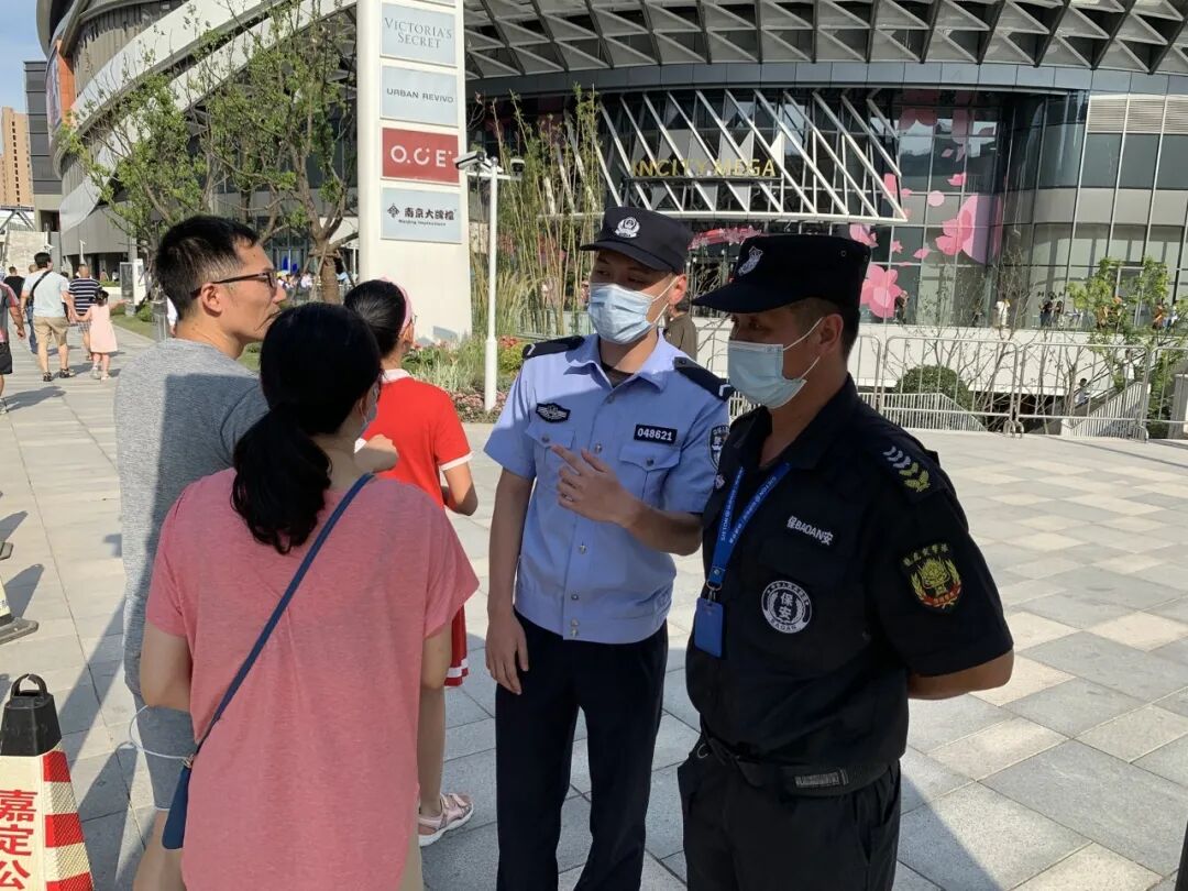 ▲ 民警在商场各出入口为游客指路,引导游客有序排队进场。